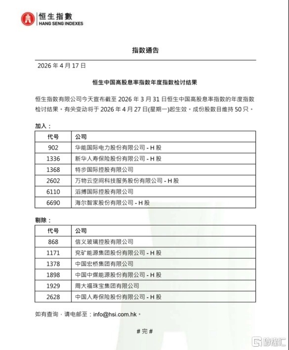4月17日配资在线论坛,恒生指数有限公司宣布截至2026年3月31日恒生中国高股息率指数的年度指数检讨结果。有关变动将于2026年4月27日(星期一)起生效。成份股数目维持50只。