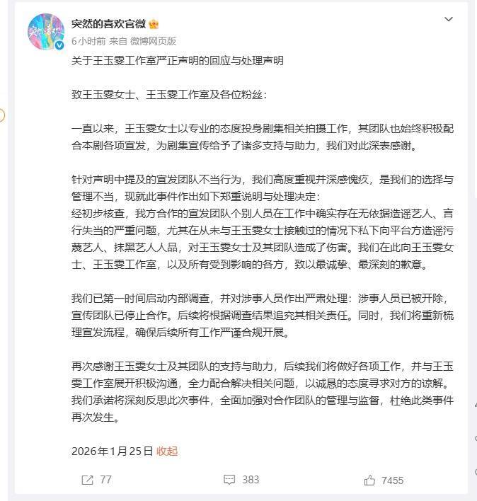 据悉,剧方合作的宣发团队在未接触王玉雯的情况下,向合作平台散布虚假信息,谎称艺人“自行策划并发布宣传物料”。工作室回应网友称:“剧方合作团队无端恶意造谣演员。”