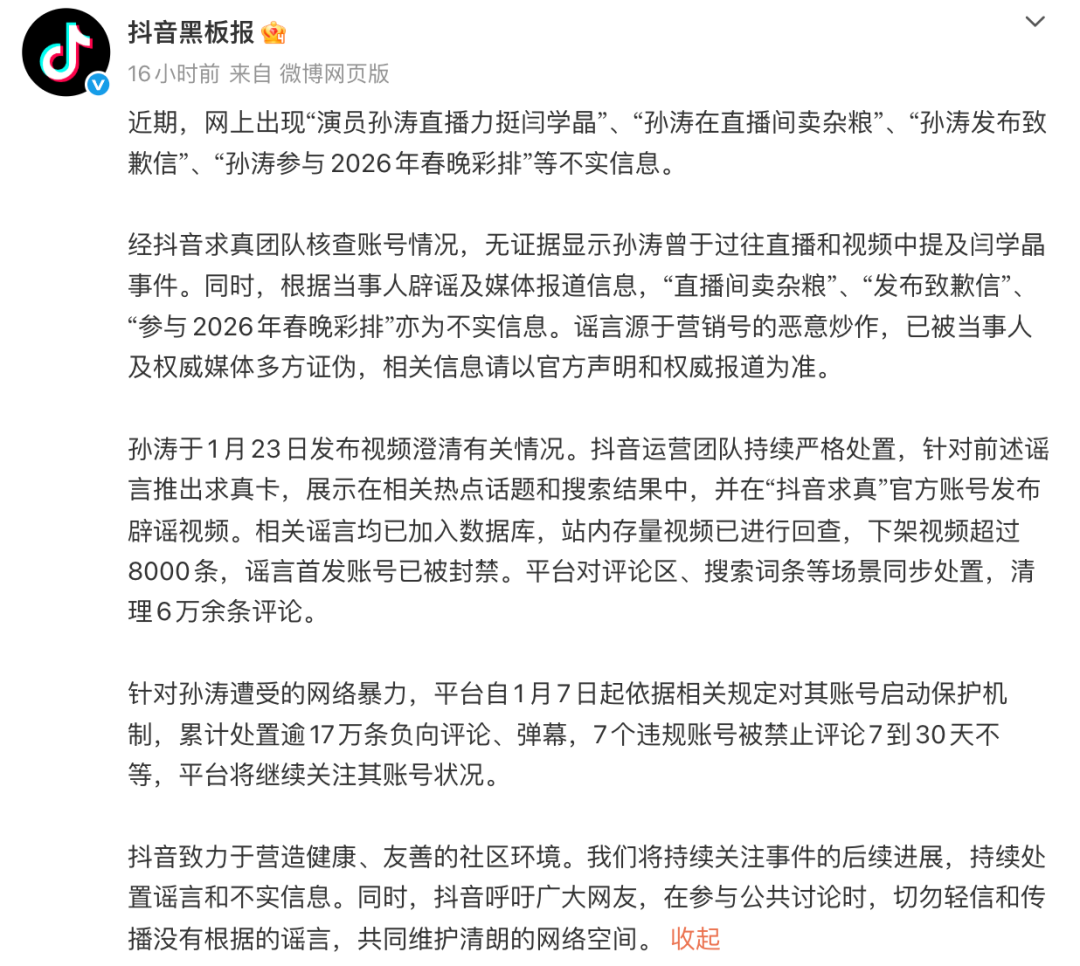 孙涛于1月23日发布视频澄清有关情况。抖音运营团队持续严格处置,针对前述谣言推出求真卡,展示在相关热点话题和搜索结果中,并在“抖音求真”官方账号发布辟谣视频。相关谣言均已加入数据库,站内存量视频已进行回查,下架视频超过8000条,谣言首发账号已被封禁。平台对评论区、搜索词条等场景同步处置,清理6万余条评论。